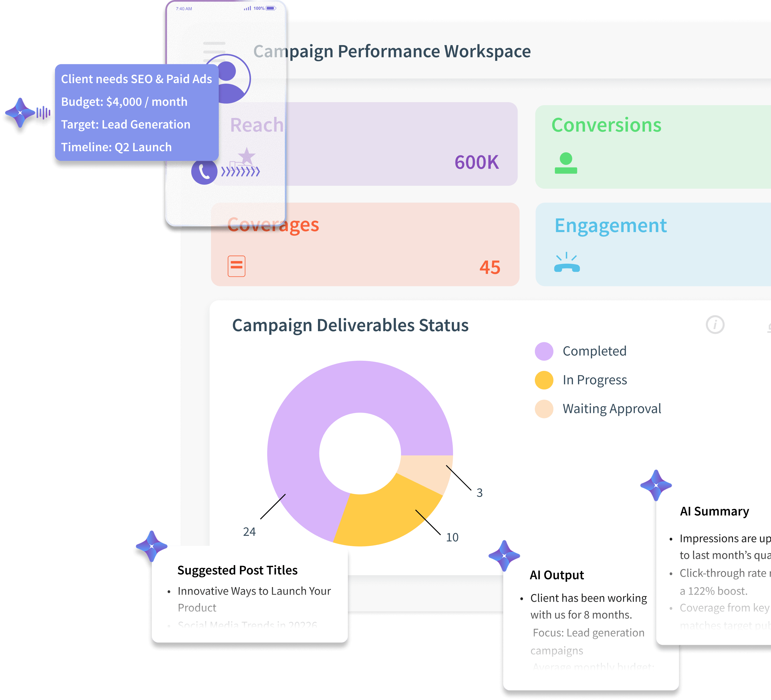 Give clients real-time visibility into campaigns, deliverables, and performance. Reduce manual reporting by up to 80%.